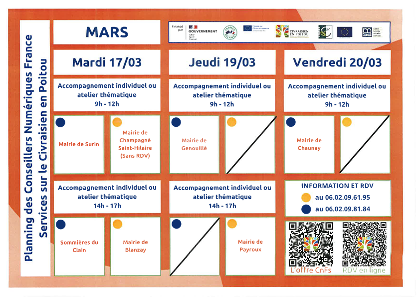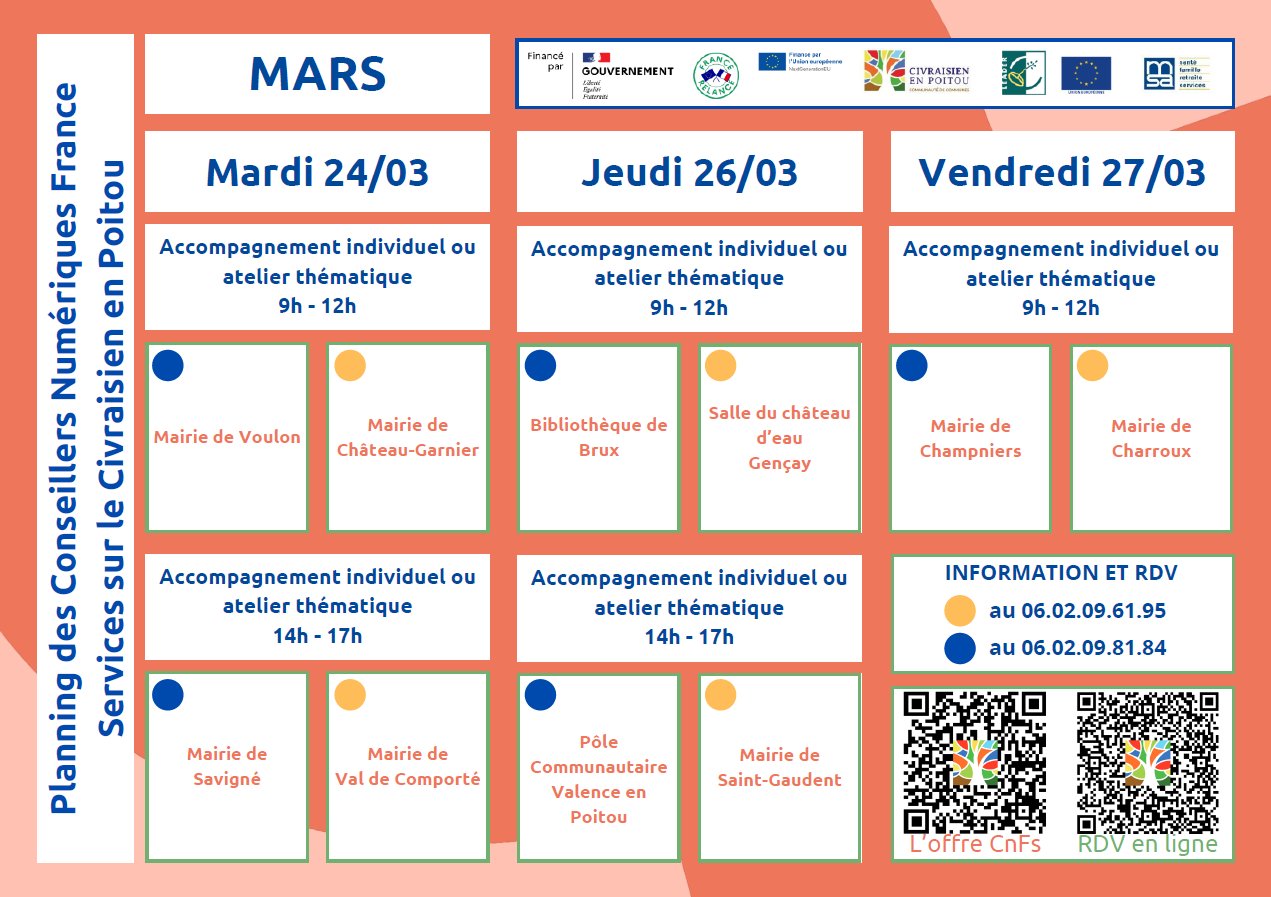 Prochaines dates à GENOUILLE :   Jeudi 5 mars, Jeudi 19 mars, Jeudi 2 avril et Jeudi 16 avril (accompagnement individuel sur rendez vous ou atelier )