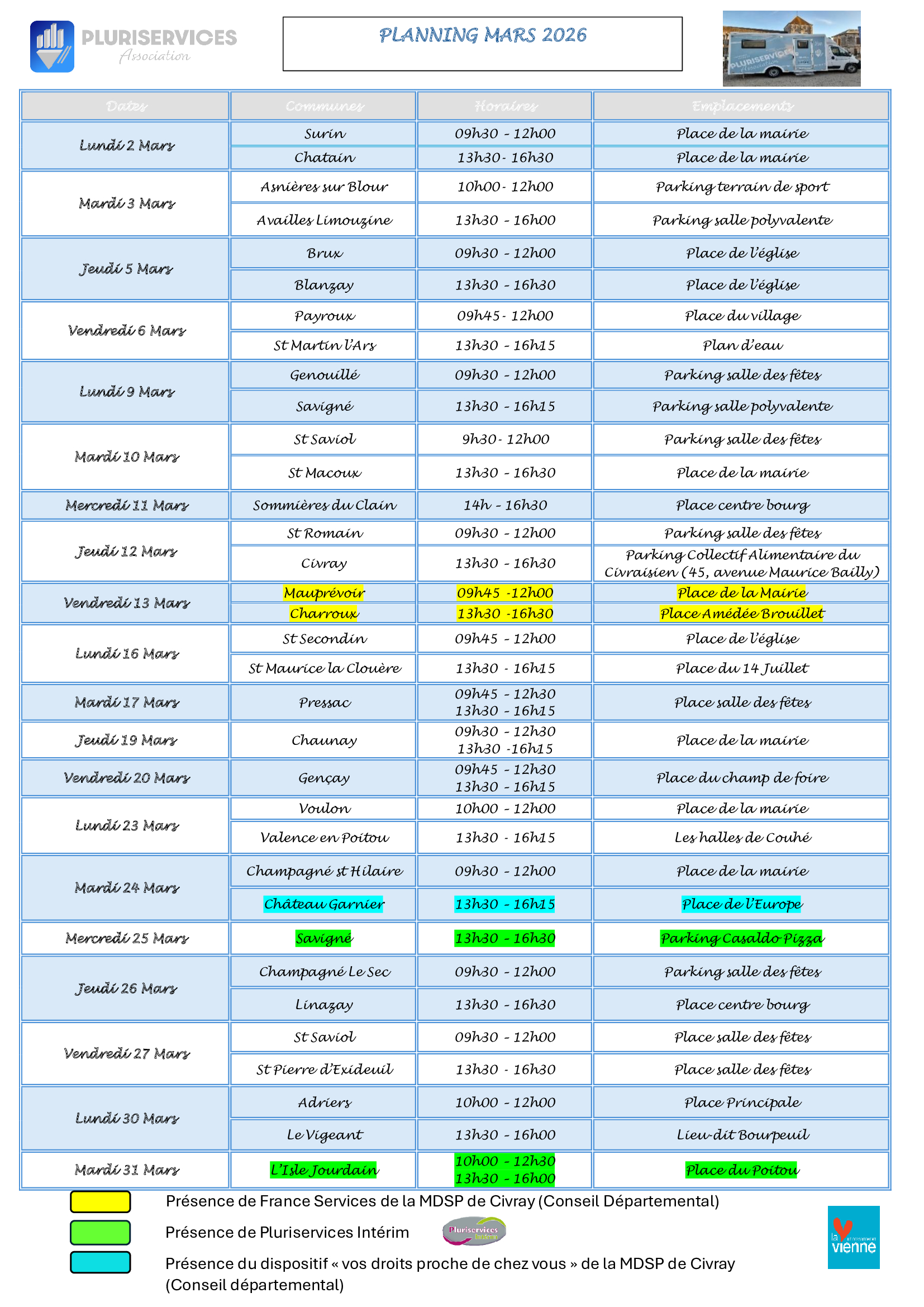 PLURISERVICES sur le parking de la Mairie de Genouillé le Mardi 24 Février et lundi 9 mars 2026-9h30à12h. Le mardi 21 Jan 2025 à 10h47 AM Les categories associées : PluriservicesNous contacterDémarches administrativesAssociationsSolidaritéLocation sallesPatrimoine remarquableNuméros d’urgenceJournal municipalPartager :