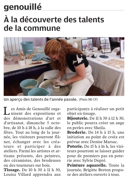 A GENOUILLÉ(Vienne)- Dimanche 5 Octobre « Des Talents de nos communes »- Amis de Genouillé Le mercredi 10 Sep 2025 à 14h51 PM Les categories associées : AssociationsNous contacterDémarches administrativesAssociationsSolidaritéLocation sallesPatrimoine remarquableNuméros d’urgenceJournal municipalPartager :