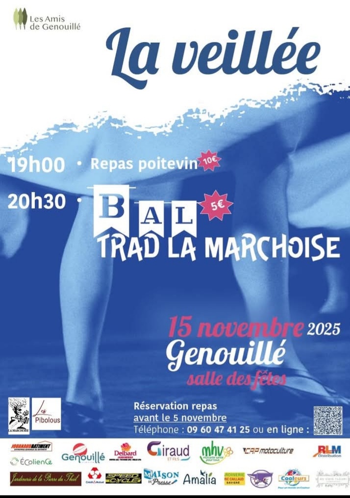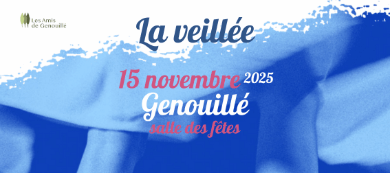 A GENOUILLÉ – 15 Novembre – Les Amis de Genouillé – La Veillée Le lundi 27 Oct 2025 à 14h47 PM Les categories associées : AssociationsNous contacterDémarches administrativesAssociationsSolidaritéLocation sallesPatrimoine remarquableNuméros d’urgenceJournal municipalPartager :