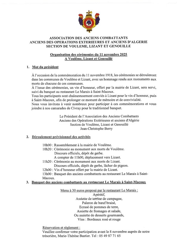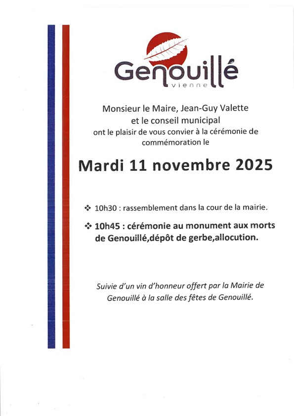 Cérémonie commémorative du 11 Novembre 2025 Le lundi 03 Nov 2025 à 11h50 AM Les categories associées : AssociationsNous contacterDémarches administrativesAssociationsSolidaritéLocation sallesPatrimoine remarquableNuméros d’urgenceJournal municipalPartager :