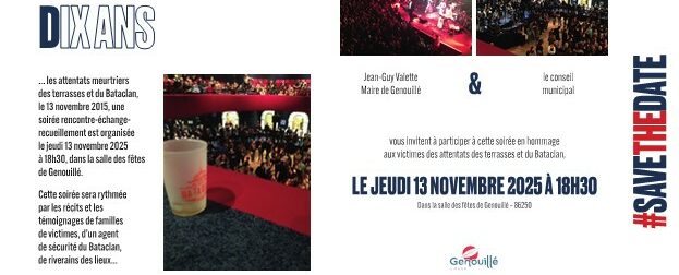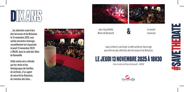 Jean-Guy Valette, Maire et le conseil municipal de Genouillé (Vienne) vous invitent à participer à une soirée en hommage aux victimes des attentats des terrasses et du Bataclan du 13 novembre 2015, LE JEUDI 13 NOVEMBRE 2025 à 18H30 dans la salle des fêtes de Genouillé (86).