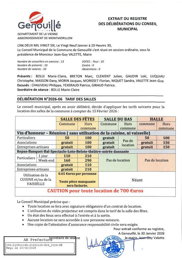 📞 Réservation : Pour louer la salle, contactez la Mairie de Genouillé aux heures d'ouverture.